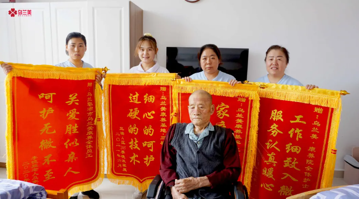 原來,李爺爺家屬口中的護(hù)士和護(hù)理人員們都在烏蘭美康養(yǎng)院工作,她們用過硬的專業(yè)知識和嫻熟的照護(hù)技能,對入院的長者進(jìn)行專業(yè)護(hù)理,用細(xì)心、耐心、愛心、責(zé)任心陪伴左右,不怕苦、不怕累,盡職盡責(zé)的為長者緩解消除恐懼、焦慮和陌生感,減輕身心痛苦。她們待長者如親人的用心照料,讓李爺爺家屬十分感動,所以連送四面錦旗,以表誠摯的感謝。