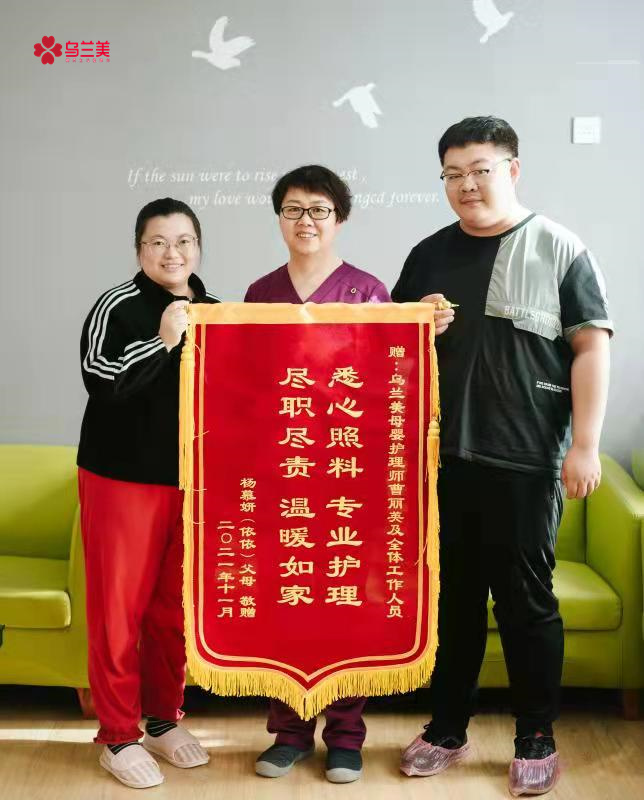 2021年11月即將滿一個(gè)月的月子生活,讓依依寶寶的媽媽難以忘懷,她親身體會(huì)到了烏蘭美醫(yī)養(yǎng)月子中心母嬰護(hù)理師曹麗英無(wú)微不至的關(guān)懷和照顧,感受了每一位工作人員飽滿的工作熱情。在寶寶滿月這天,特地給烏蘭美醫(yī)養(yǎng)月子中心準(zhǔn)備了禮物——一面寫著“悉心照料,專業(yè)護(hù)理,盡職盡責(zé),溫暖如家”的感謝錦旗,錦旗充分表達(dá)了寶媽及家屬對(duì)烏蘭美醫(yī)養(yǎng)月子中心所有工作人員及母嬰護(hù)理師曹麗英深切的感激之情。