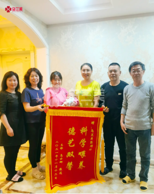 △寶媽烏云娜一家贈(zèng)送錦旗以此表達(dá)對(duì)烏蘭美月嫂張順玲的感激